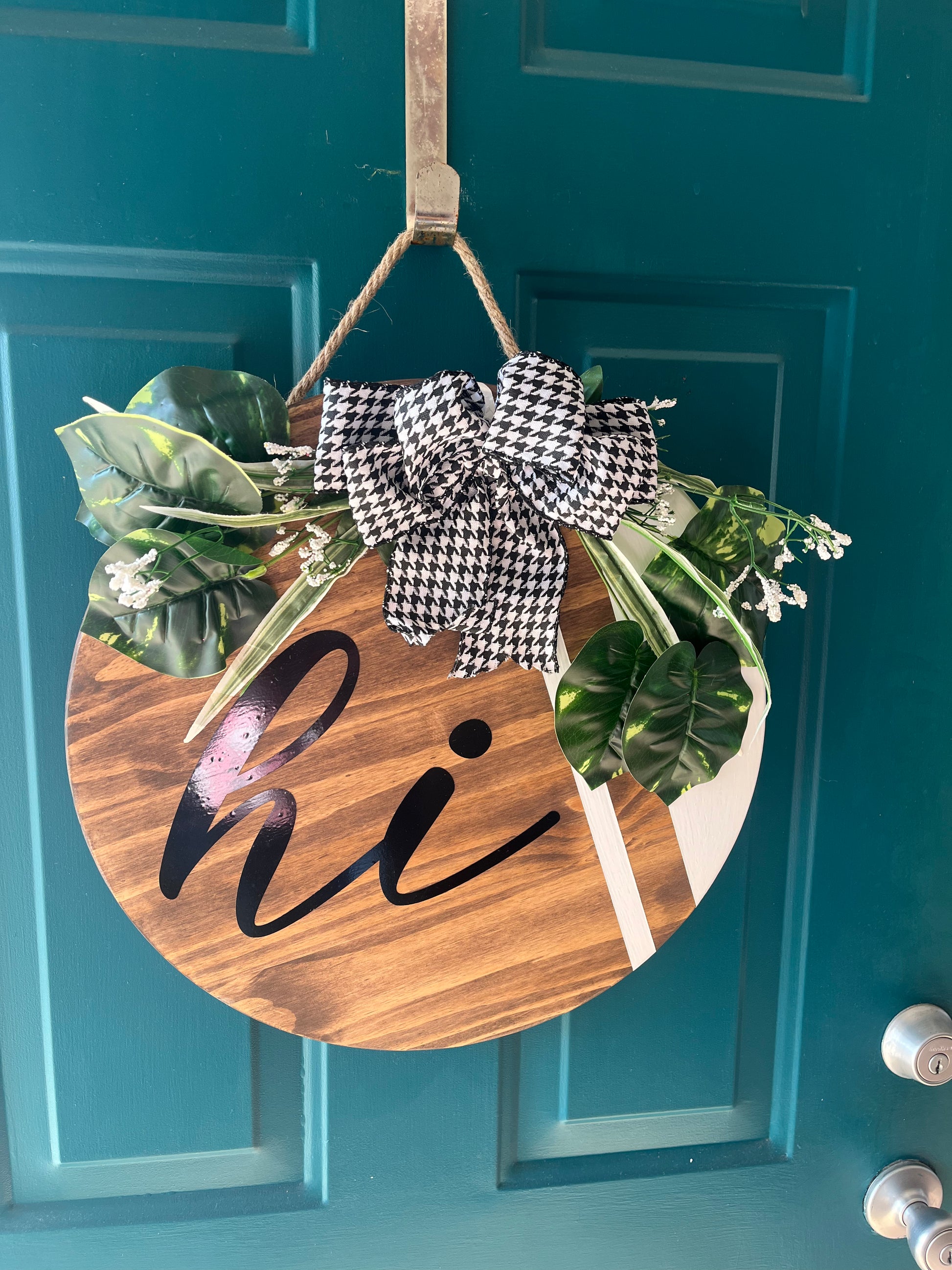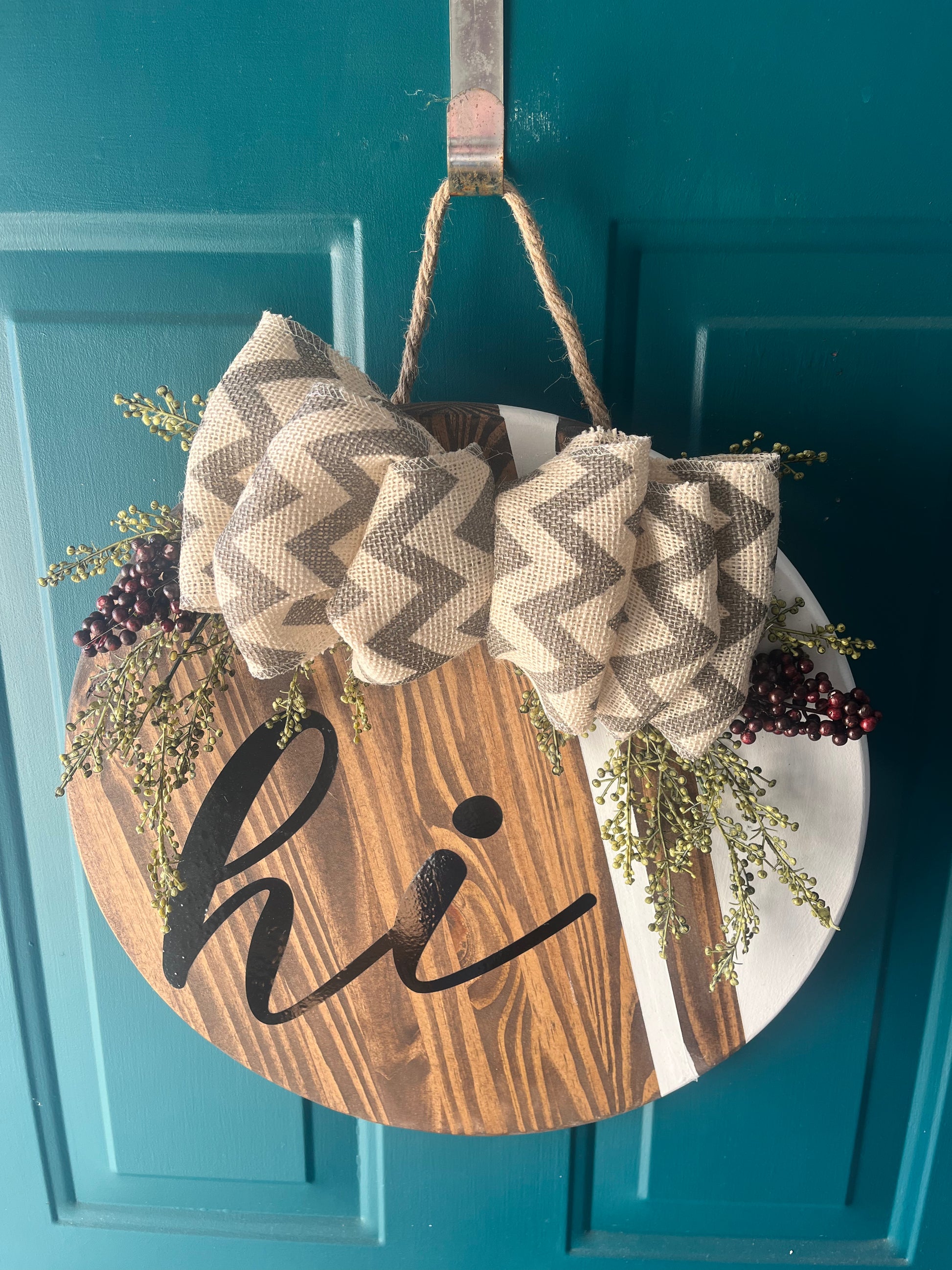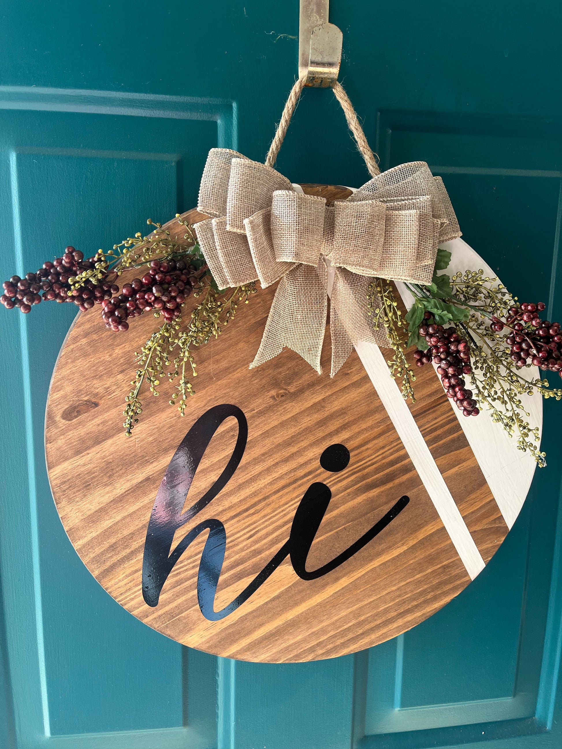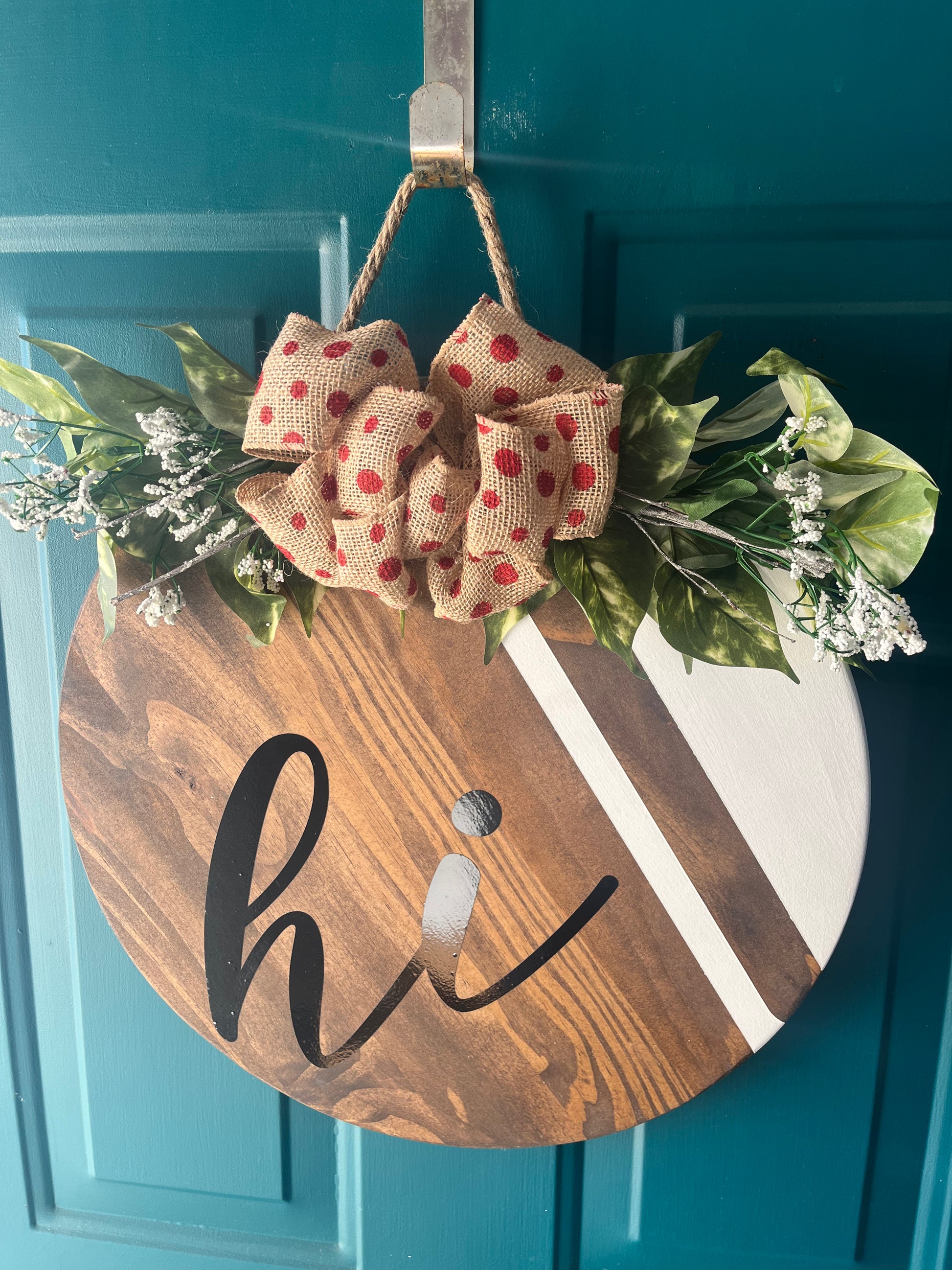 Hand stained and painted. Hand made bow/ribbon with artificial green/flower decor. The stained/painted wood is sealed with a UV protective sealer, the ‘hi’ is a black vinyl adhesive. Bow and greenery is stapled and glued on.