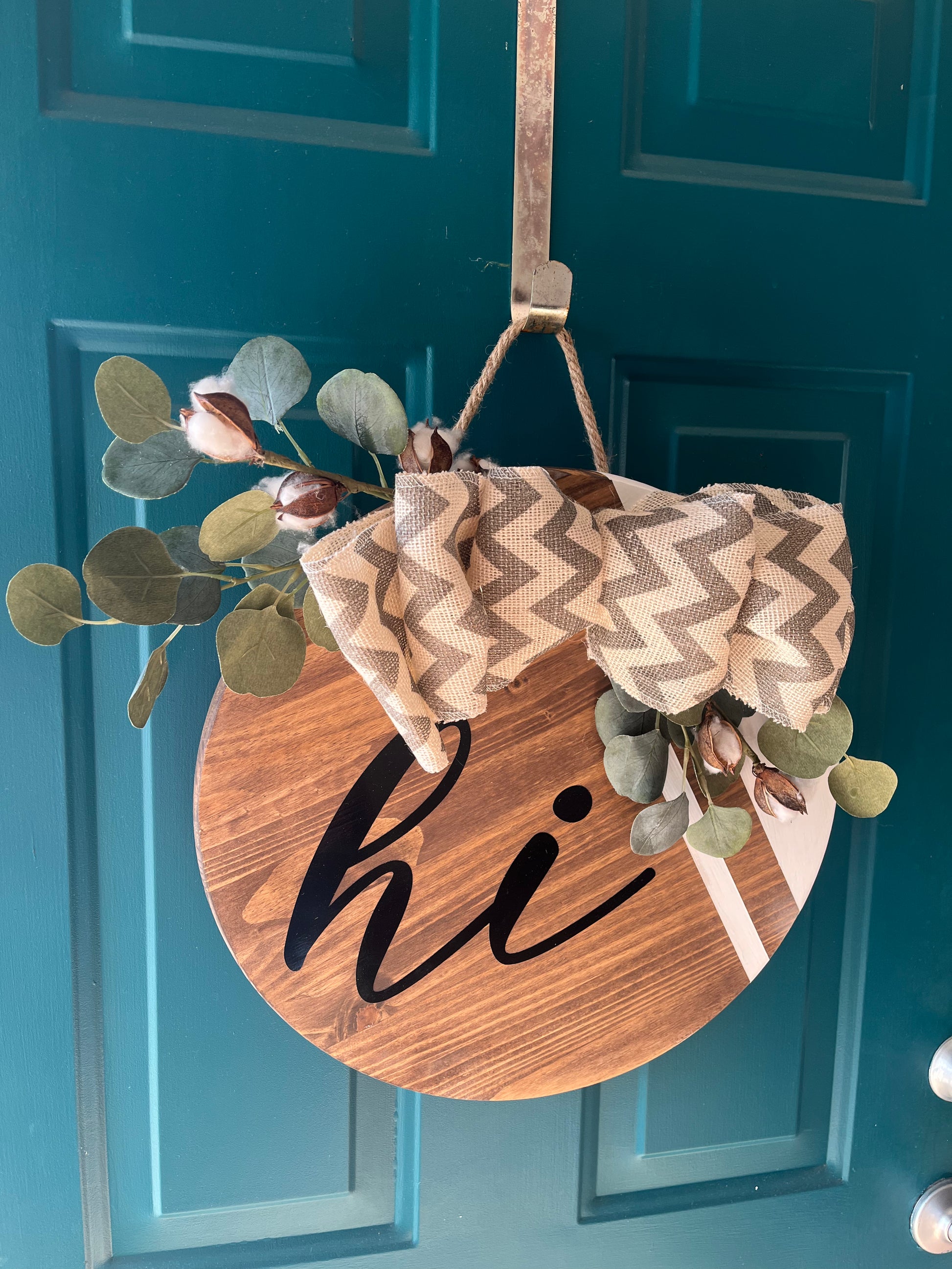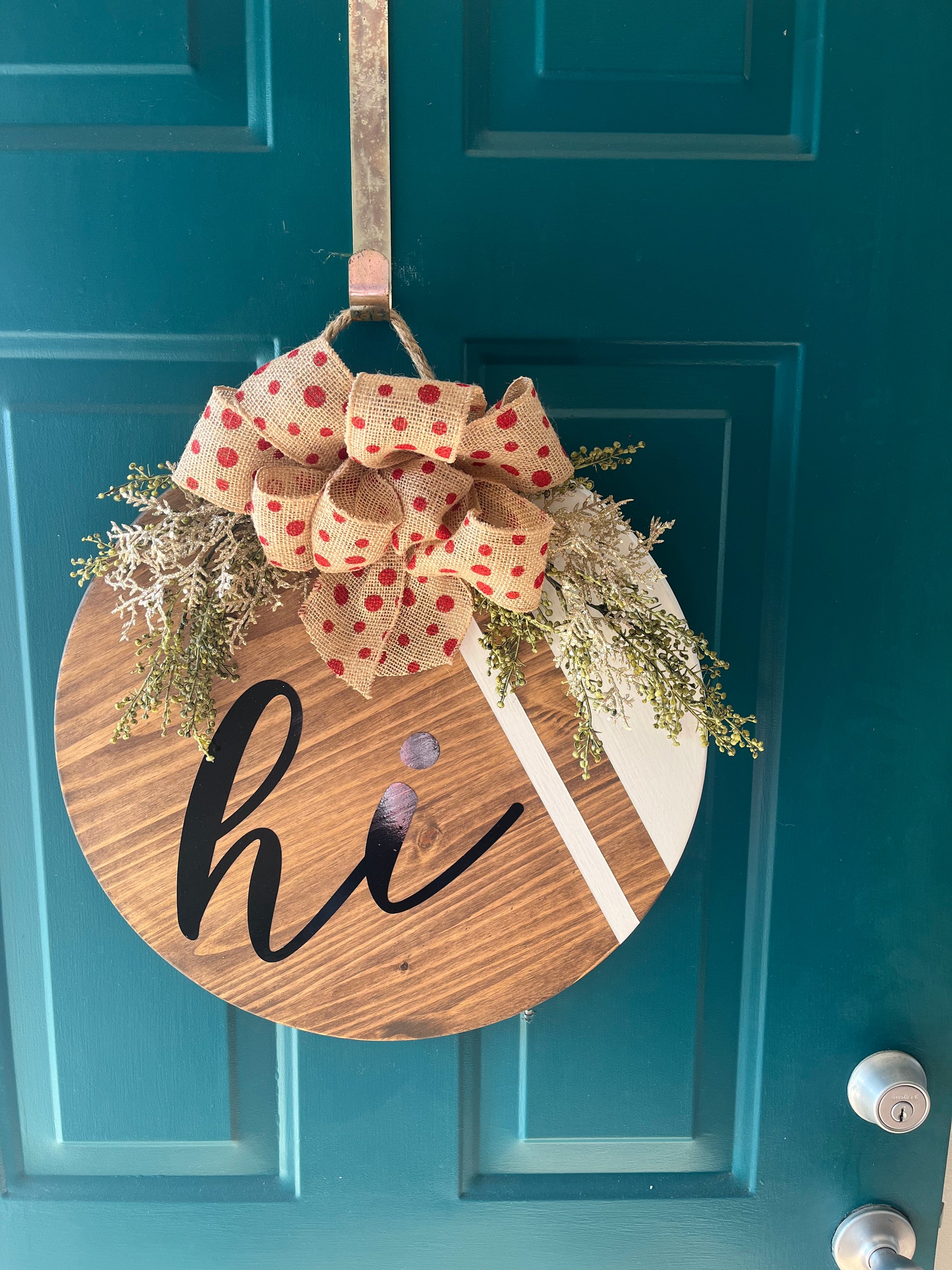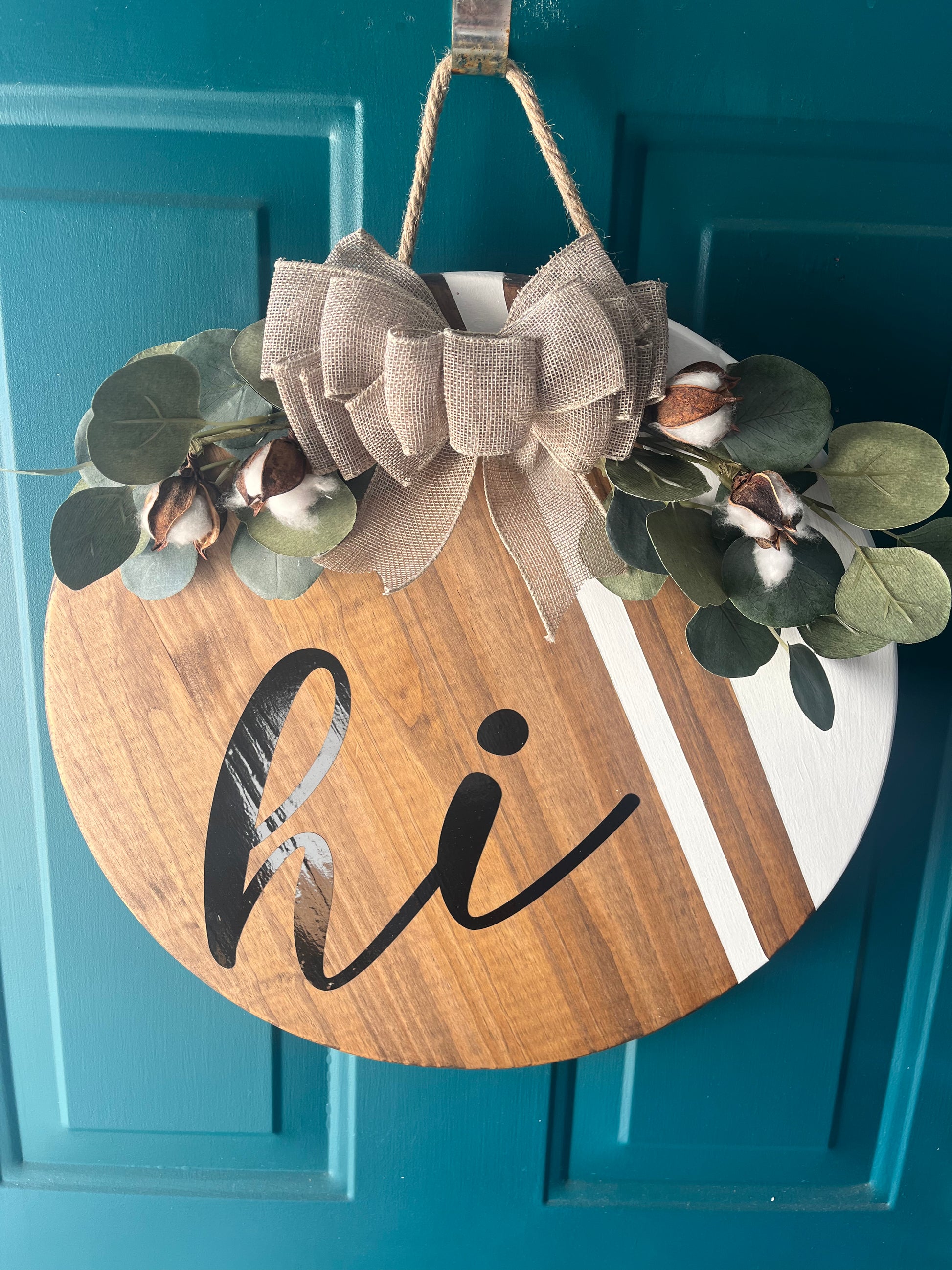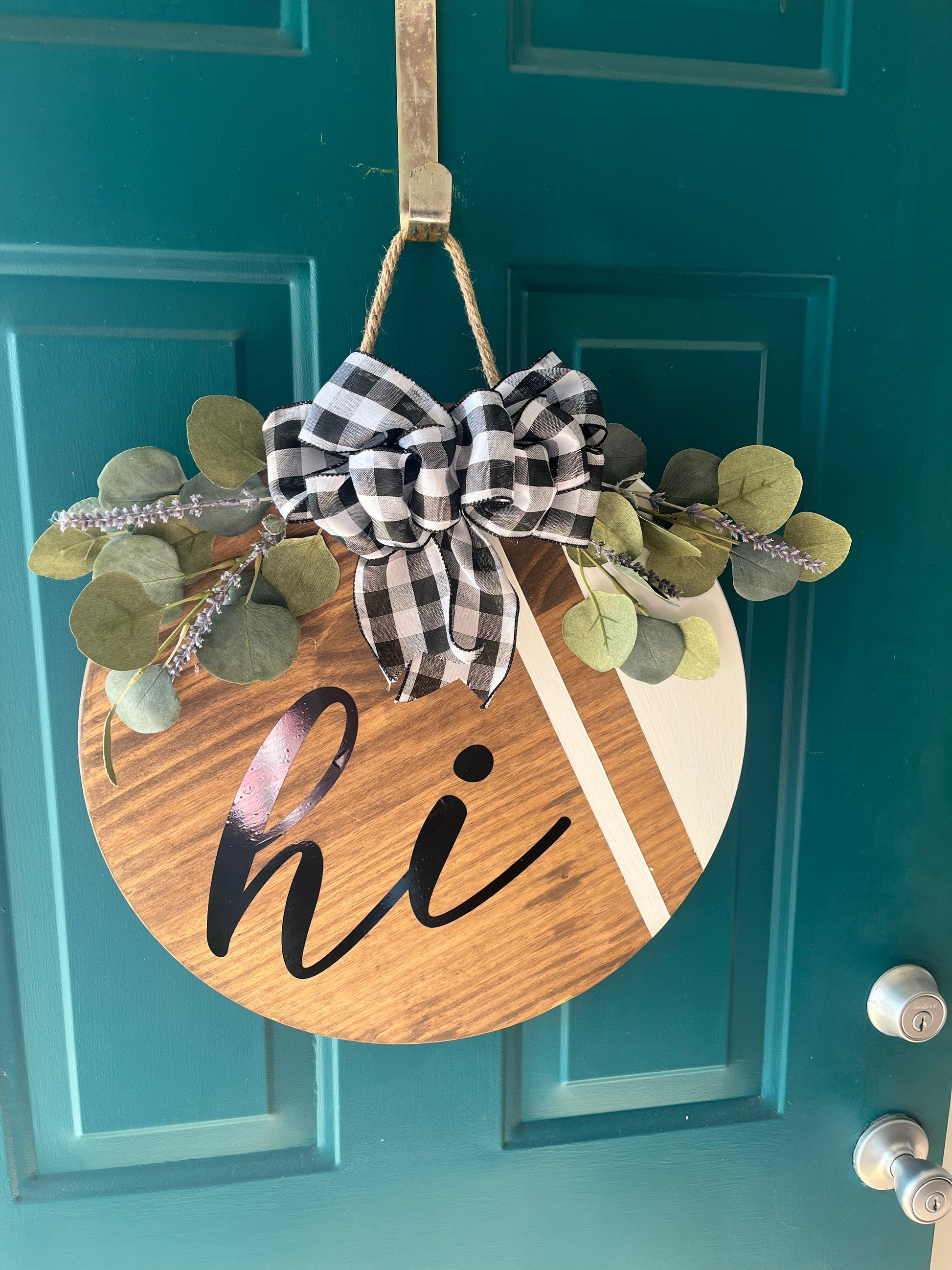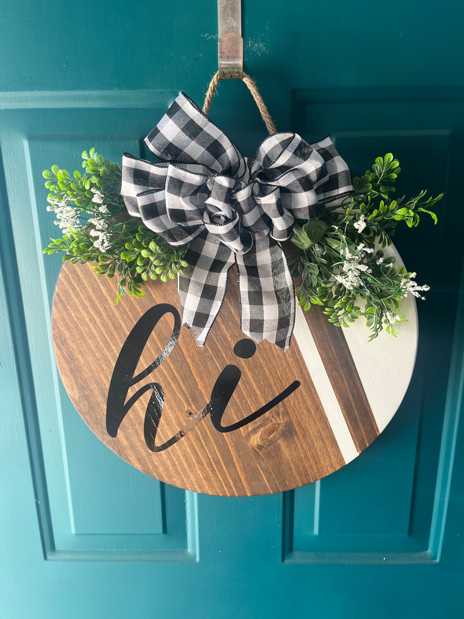 Hand stained and painted. Hand made bow/ribbon with artificial green/flower decor. The stained/painted wood is sealed with a UV protective sealer, the ‘hi’ is a black vinyl adhesive. Bow and greenery is stapled and glued on.