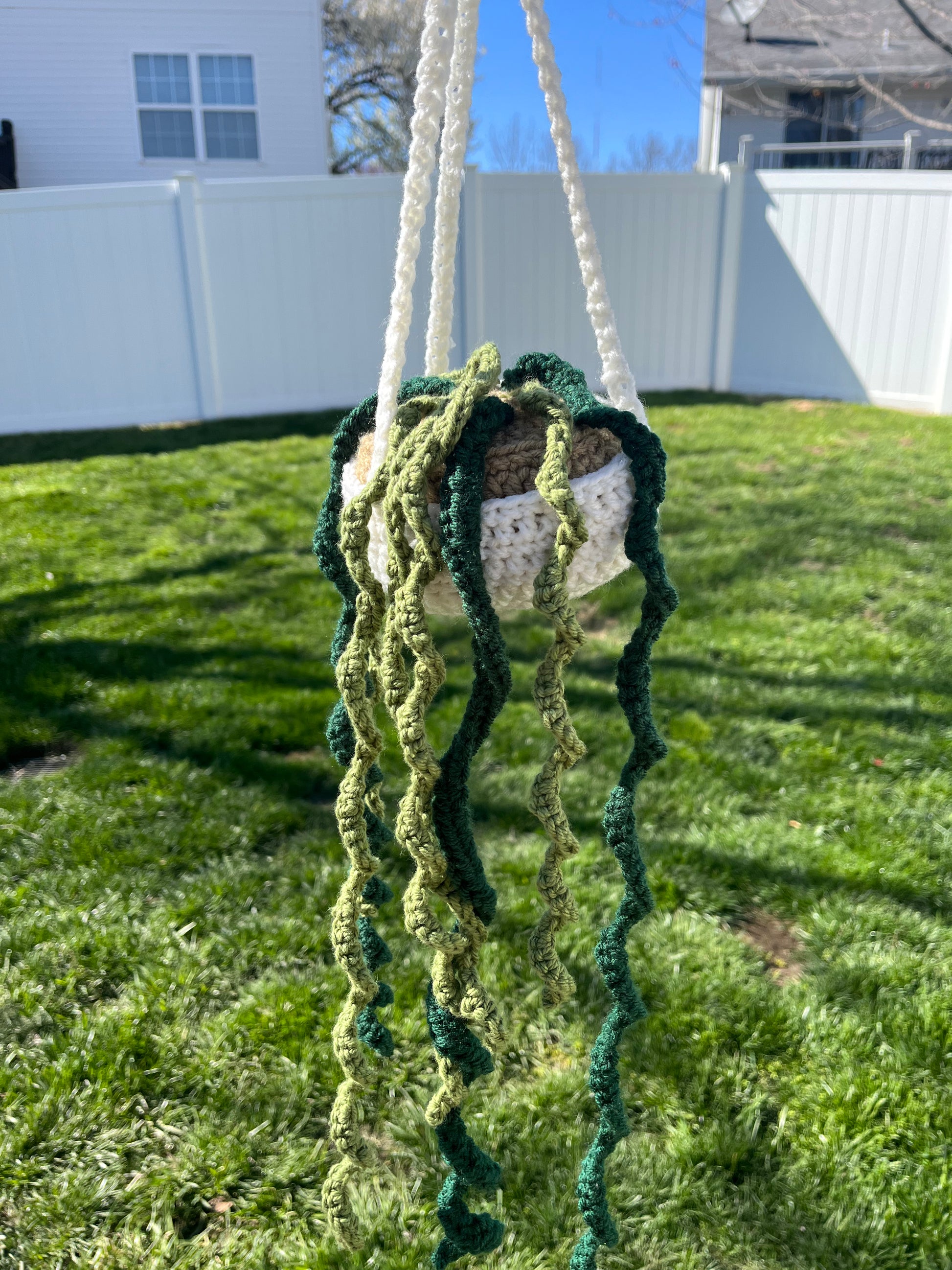 Handmade crochet hanging curly plant. Every item will be slightly different due to the handmade nature, but the coloring will be similar and the overall design will be similar.