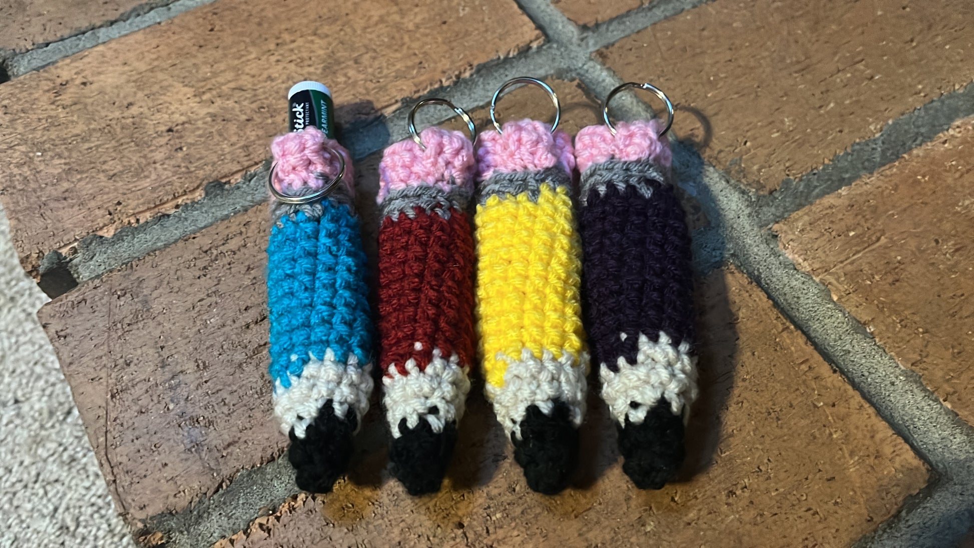 Handmade crochet pencil looking keychain to hold a single stick of lip balm. Every item will be slightly different due to the handmade nature, but the coloring will be similar and the overall design will be similar.