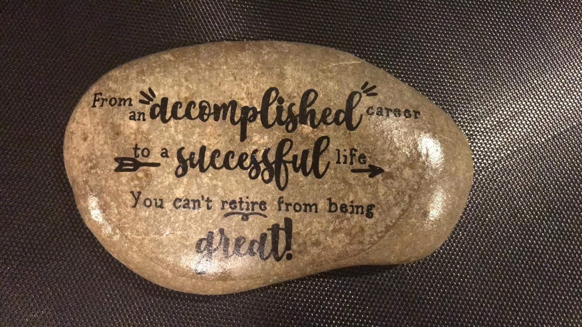 Our large stones are roughly 8-10" wide, featuring our standard phrase and design about a beloved coworker with additional emphasis marks and arrow details.
