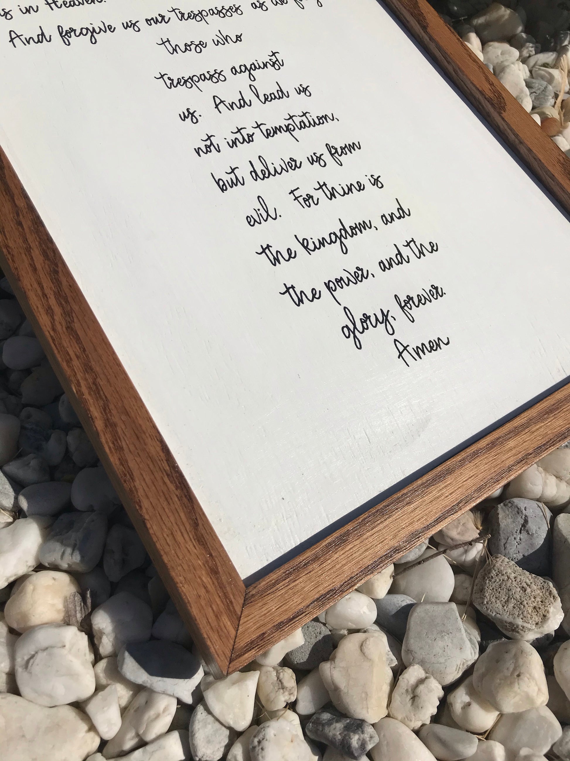 Our hand painted wood wall sign measures 10"x18" in size and features the Lord's Prayer in a cross design with our medium stained frame.