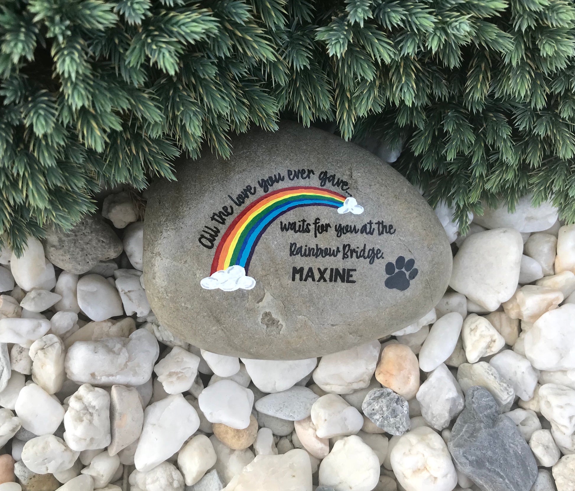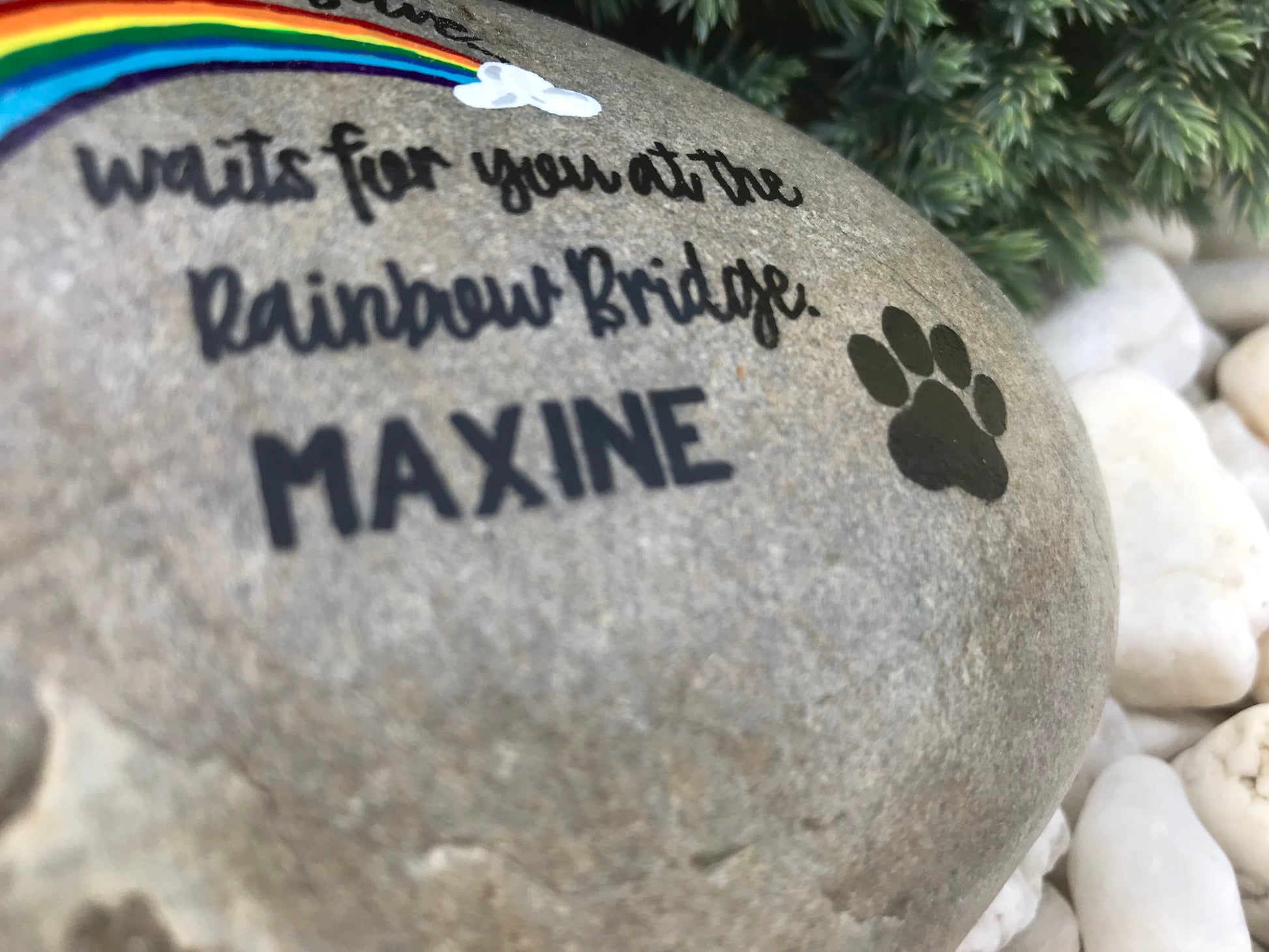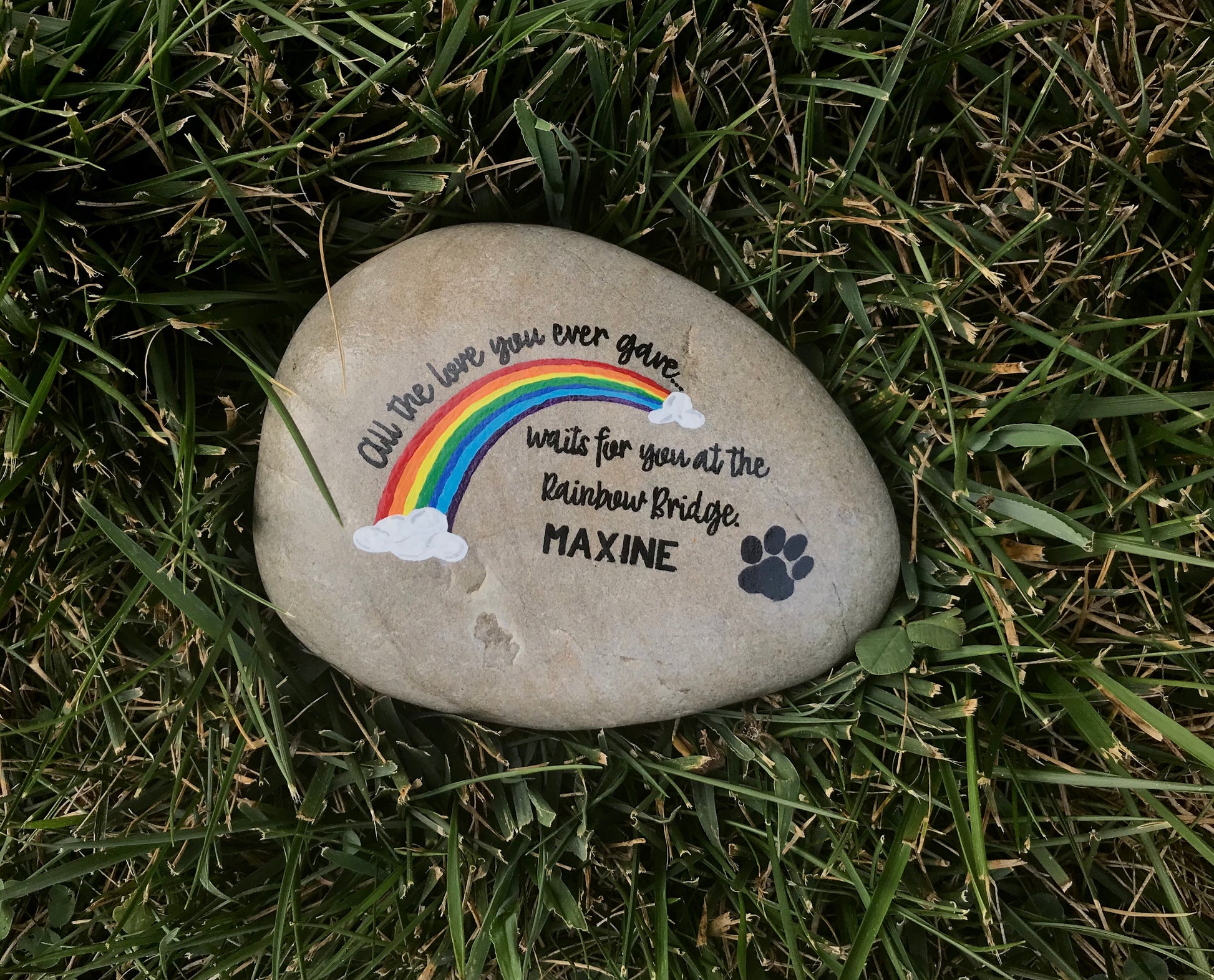 Our medium stones are roughly 5-6" wide, featuring our standard poem and design about our beloved pets with an additional paw print and rainbow details.