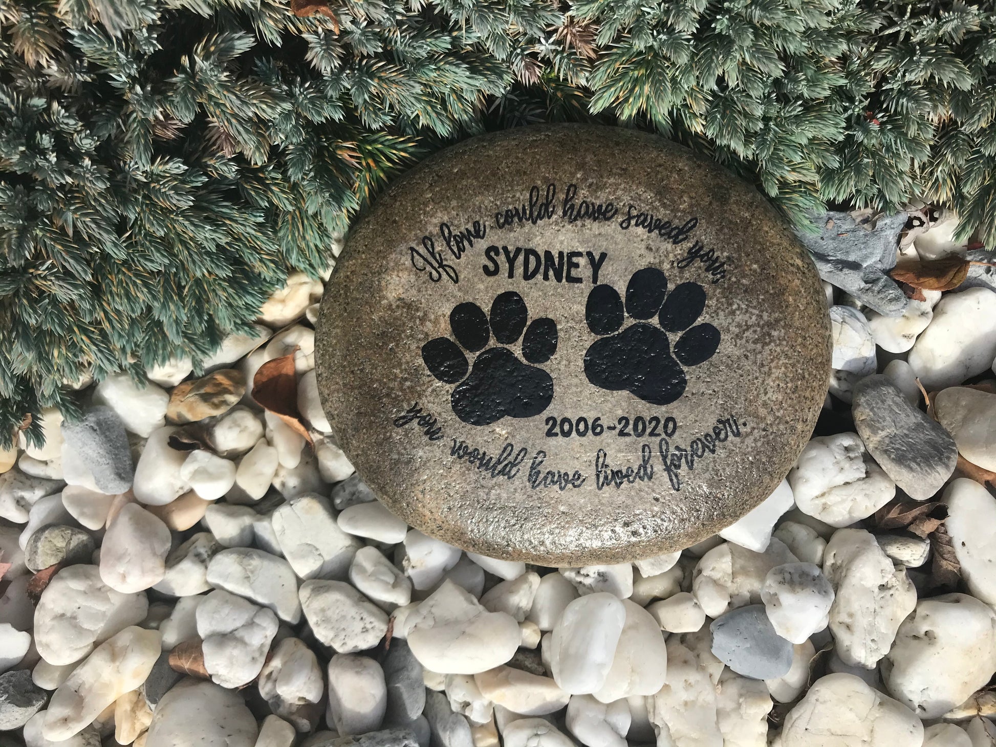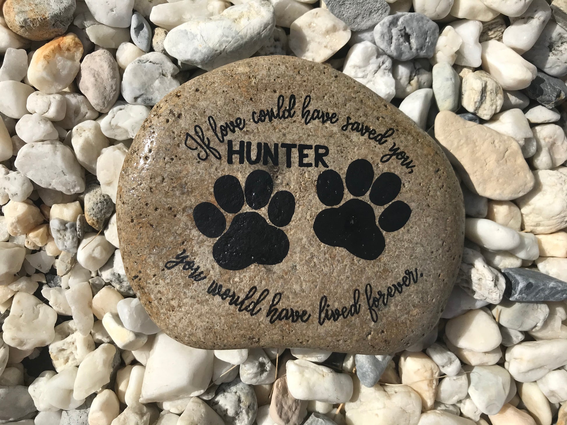 Our medium stones are roughly 5-6" wide, featuring our standard poem and design about our beloved pets with additional paw print details.