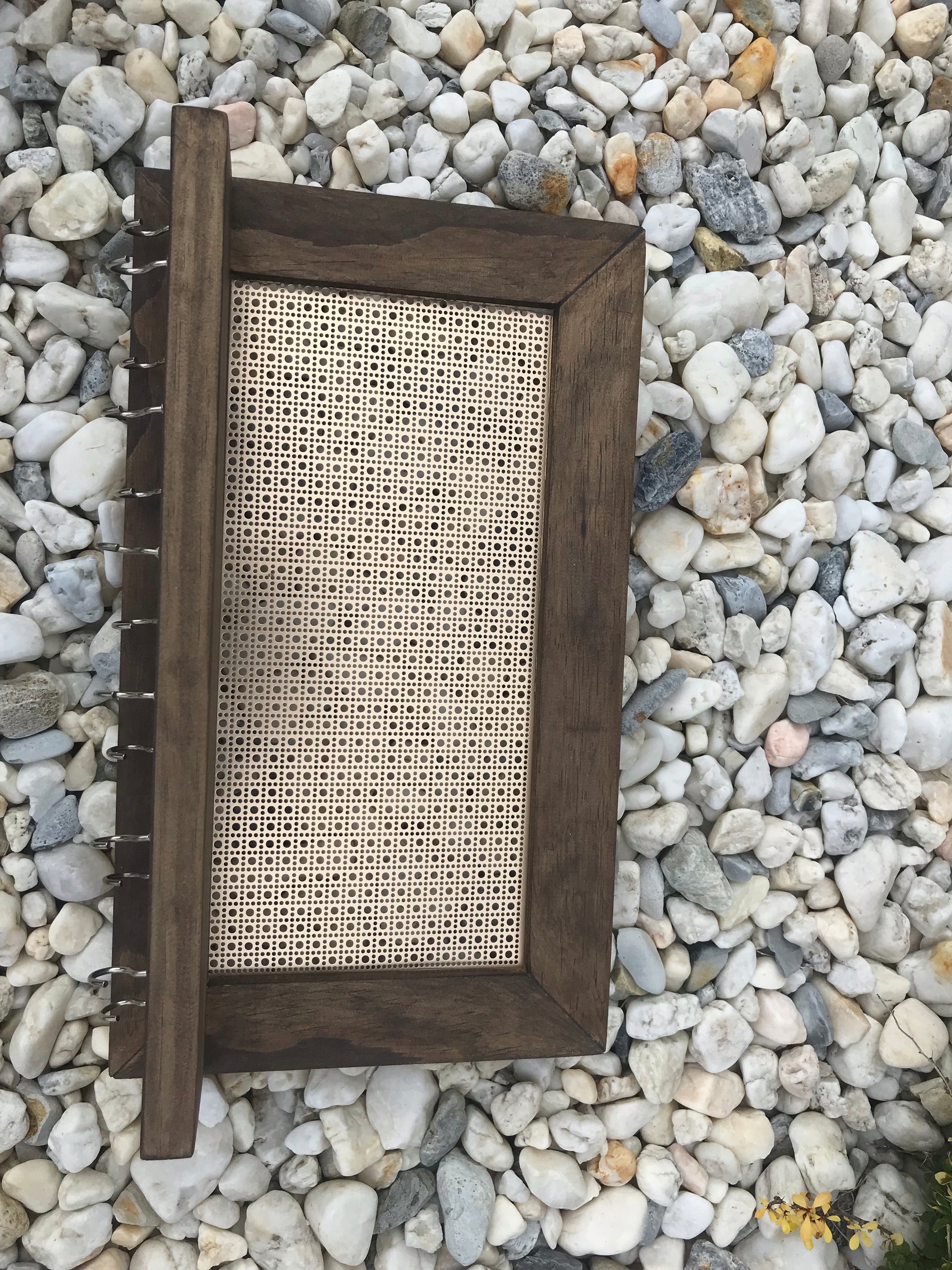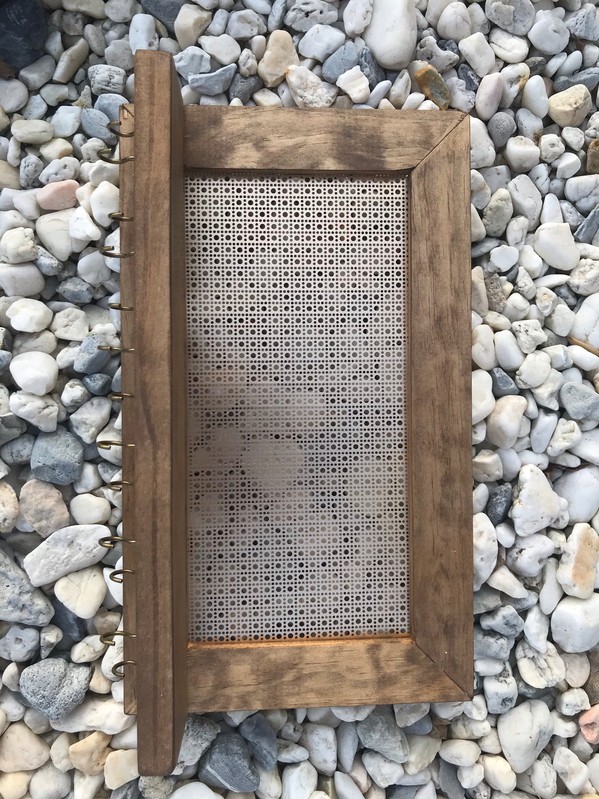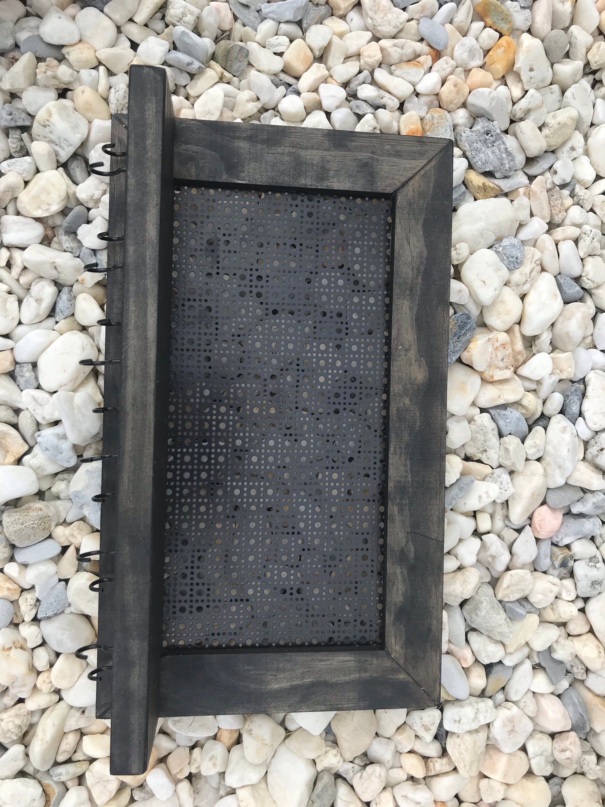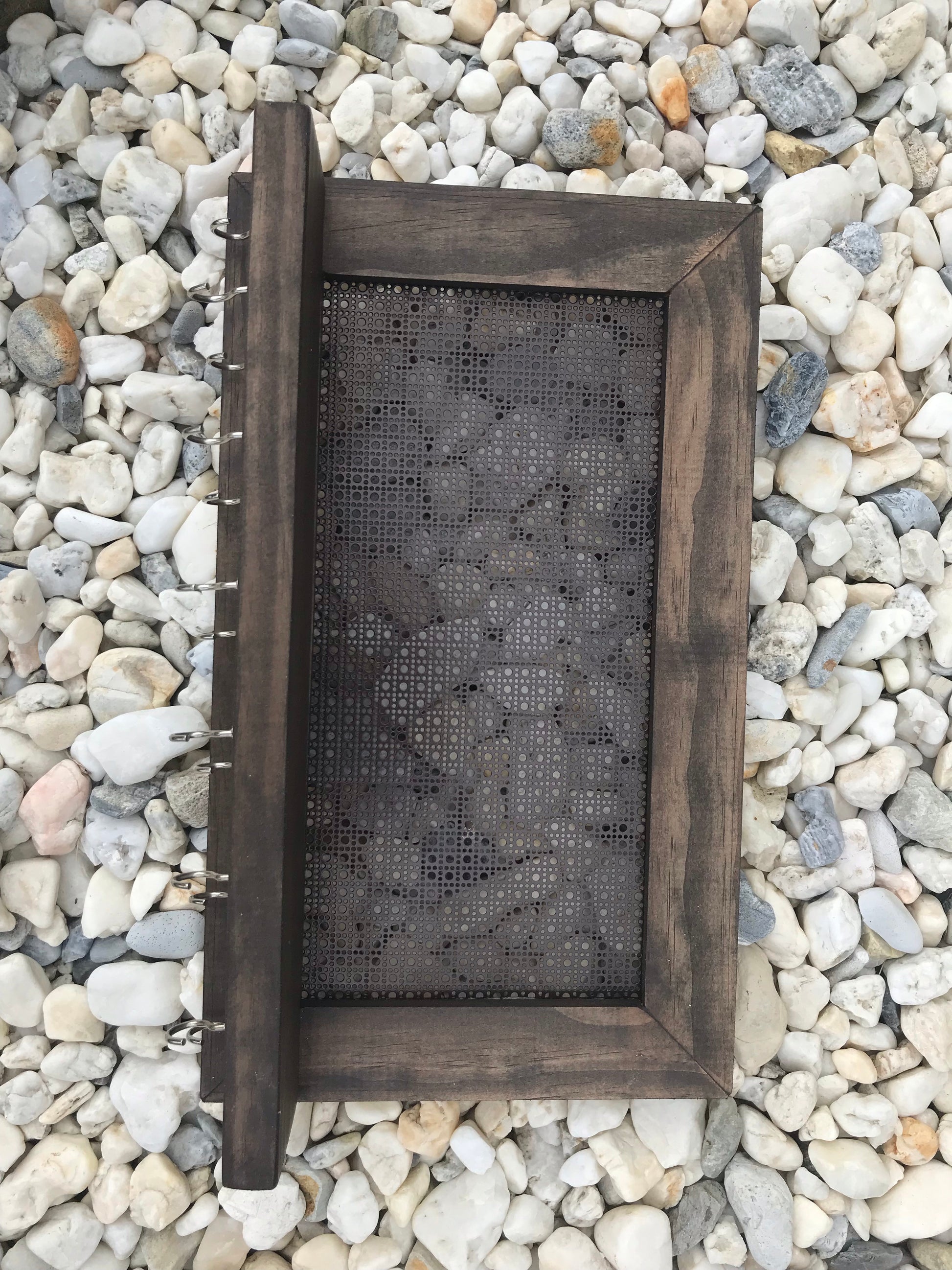 Stained in our dark wood stain to complete the beautiful brown metal mesh and ready to hang!