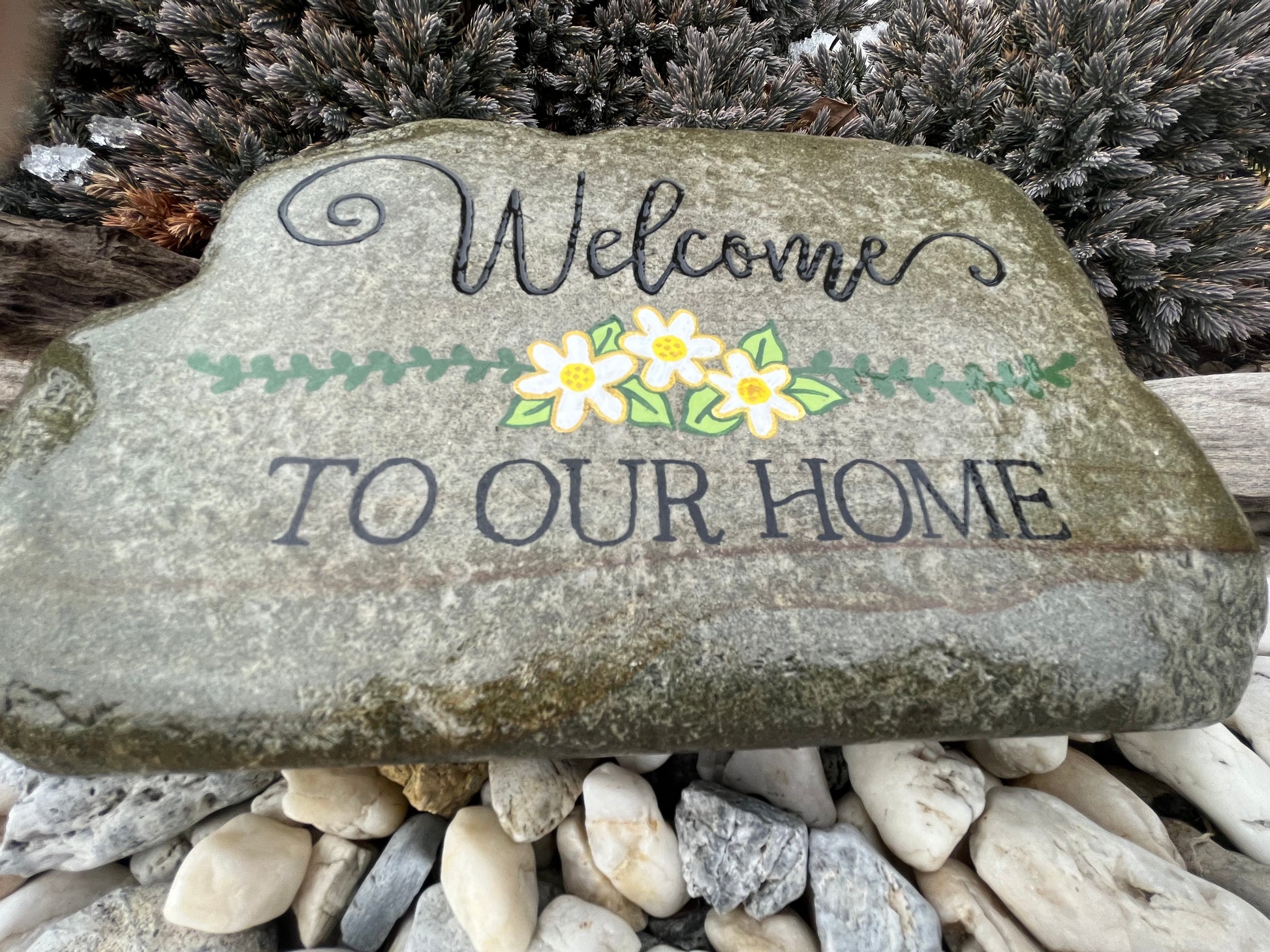 Our paver stones are roughly 9"x7"x1", featuring a partially engraved surface (the 'Welcome' is engraved and painted) and a fully hand-painted 'to our Home' and daisy details complete this design.